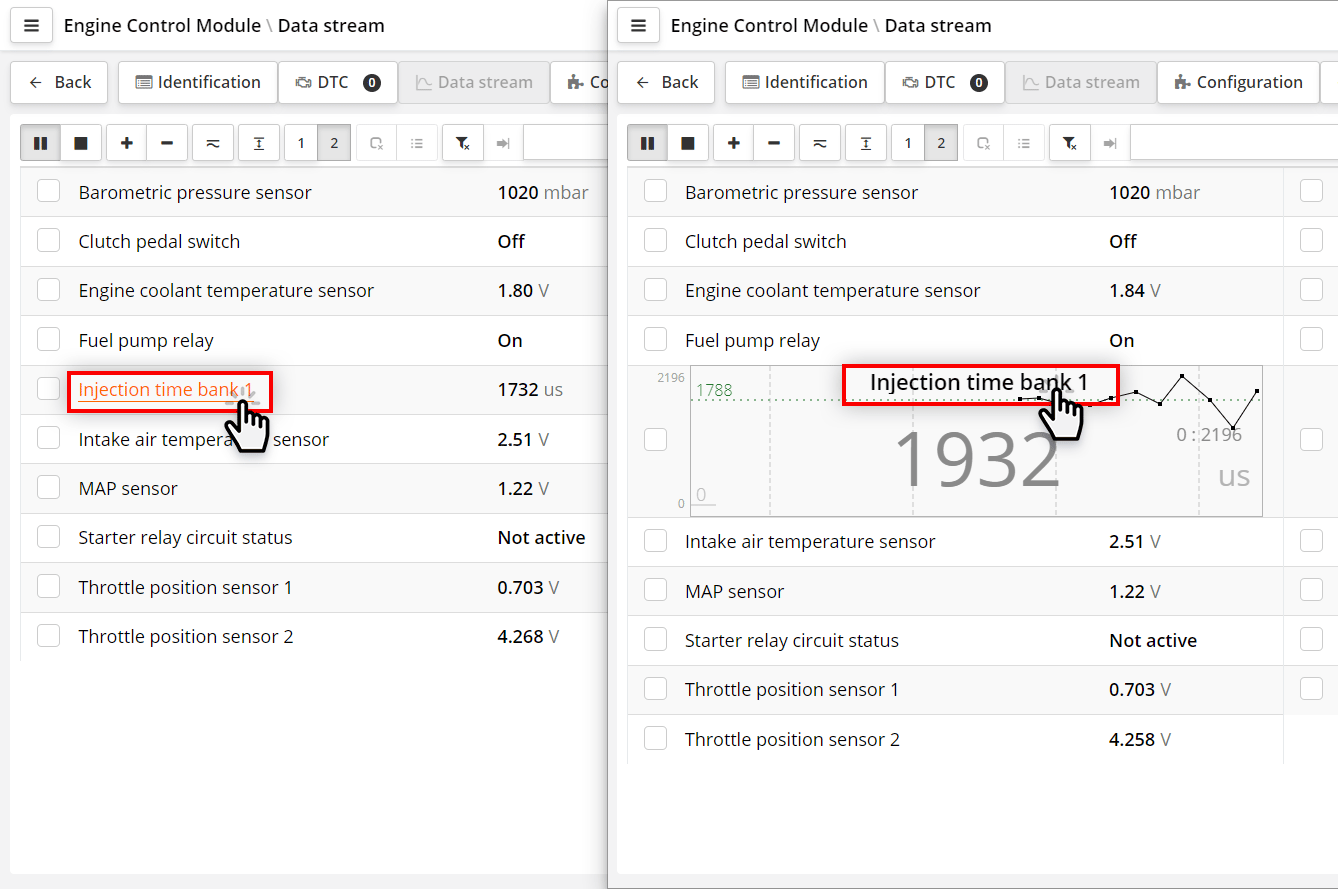 Many control units allow you to temporarily control actuators (injectors, motors, solenoid valves) to check their performance.