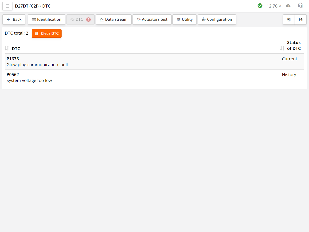 If the DTC has the status "active" or "current" then it is highlighted in red, otherwise it is highlighted in gray.