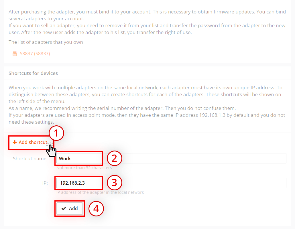 Enter a name for the adapter shortcut. We recommend writing the adapter serial number. Then you will not confuse them.